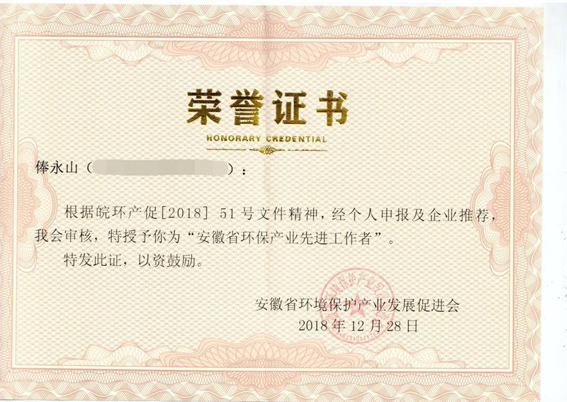 根據(jù)《關(guān)于申報2018年安徽省環(huán)保產(chǎn)業(yè)優(yōu)秀企業(yè)及先進工作者的通知》(皖環(huán)產(chǎn)促【2018】第51號)文件精神,經(jīng)過我公司申請及安徽省環(huán)境保護產(chǎn)業(yè)發(fā)展促進協(xié)會審核,我公司榮獲2018年度“安徽省環(huán)保產(chǎn)業(yè)優(yōu)秀企業(yè)”榮譽稱號,吳鴻飛同志、俸永山同志獲得“安徽省環(huán)保產(chǎn)業(yè)先進工作者”榮譽稱號。